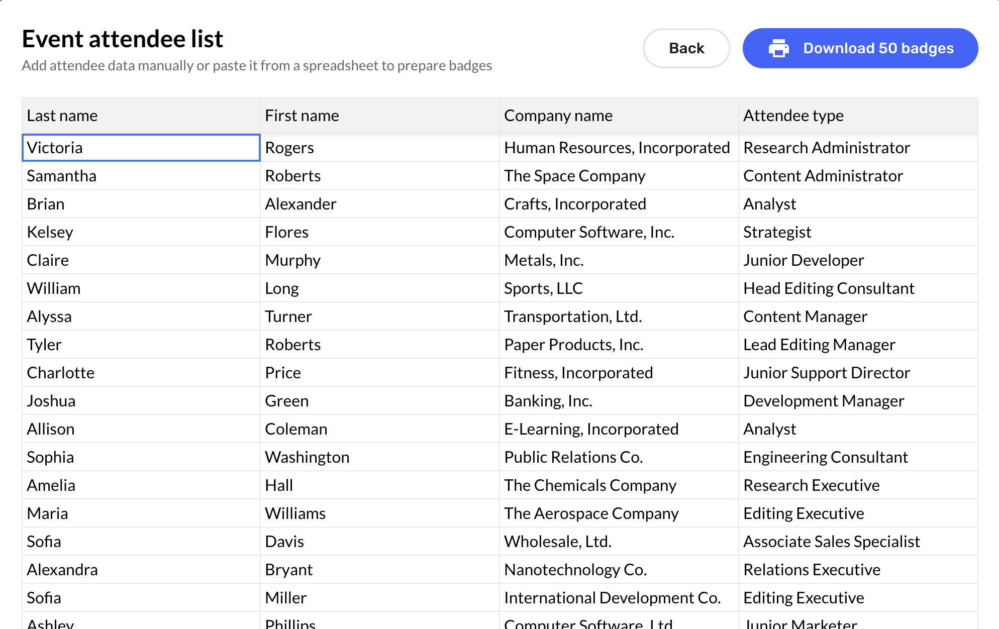 Manually enter attendee data or paste it from a spreadsheet. Set up as many fields as you need — works seamlessly with data from Eventbrite, Cvent, Meetup, and plain XLS/CSV.